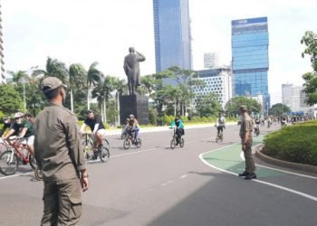 Kecamatan Setiabudi, Jakarta Selatan, memonitoring penerapan protokol kesehatan (Prokes) pada pengguna jalur sepeda di areal spot budaya Jalan Jenderal Sudirman...