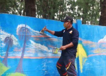 Area Plaza Kabupaten Kepulauan Seribu dan tembok di sepanjang jalan utama di Pulau Pramuka, Kelurahan Pulau Panggang, Kecamatan Kepulauan Seribu...
