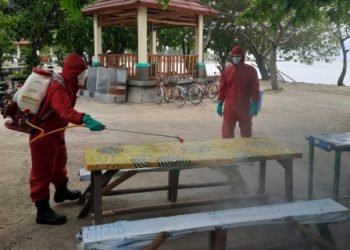 Petugas Sektor 8 Suku Dinas Penanggulangan Kebakaran dan Penyelamatan (Sudin Gulkarmat) Jakarta Utara dan Kepulauan Seribu melakukan penyemprotan disinfektan di...