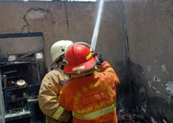 Petugas Suku Dinas Penanggulangan Kebakaran dan Penyelamatan (Gulkarmat) Sektor IX Kecamatan Pasar Minggu, berhasil memadamkan api yang membakar rumah warga...