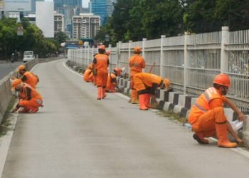 Petugas Penanganan Prasarana dan Sarana Umum (PPSU) Kelurahan Mampang Prapatan, Mampang Prapatan, Jakarta Selatan, Selasa (15/12), melakukan pembersihan jalur Transjakarta...