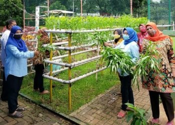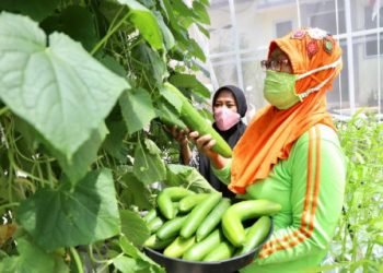 Kelompok Wanita Tani (KWT) Teratai RW 05 Sunter Muara, Sunter Agung, Tanjung Priok, Jakarta Utara melakukan panen timun hijau dari...