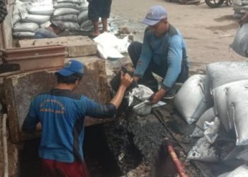 Suku Dinas Sumber Daya Air (Sudin SDA) Jakarta Barat melakukan pengurasan saluran air di Jl Angke Barat, RT 002/001, Kelurahan...