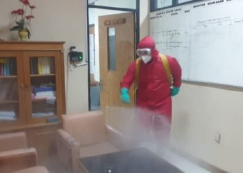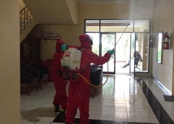 Sektor 8 Suku Dinas Penanggulangan Kebakaran dan Penyelamatan (Sudin Gulkarmat) Jakarta Utara dan Kepulauan Seribu melakukan penyemprotan disinfektan di kantor...