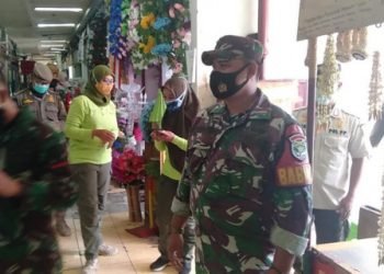 Petugas gabungan Kecamatan Kebon Jeruk melakukan sosialisasi gerakan 3M (Memakai Masker, Mencuci Tangan dan Menjaga Jarak di areal Pasar Kembang…...