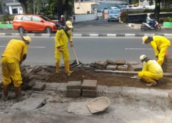Suku Dinas Bina Marga Jakarta Selatan memperbaiki trotoar yang rusak di Jalan Raya Pasar Minggu KM 18, Kelurahan Pejaten Timur,...