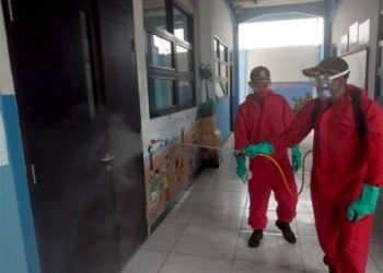 Petugas Sektor 7 Suku Dinas Penanggulangan Kebakaran dan Penyelamatan (Sudin Gulkarmat) Jakarta Utara dan Kepulauan Seribu melakukan penyemprotan disinfektan di...
