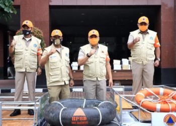 Wali Kota Jakarta Pusat, Bayu Meghantara, menyerahkan bantuan peralatan penanggulangan banjir kepada aparatur kecamatan dan kelurahan , Senin (23/11). Bantuan...