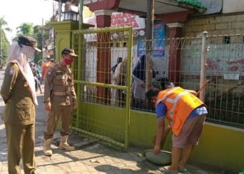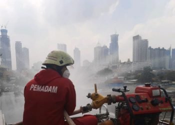 Suku Dinas Penanggulangan Kebakaran dan Penyelamatan (Gulkarmat) Jakarta Pusat melakukan penyemprotan di sinfektan di sepanjang Jalan Aipda KS Tubun, Kecamatan...