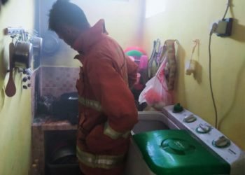 Petugas Sektor 8 Suku Dinas Penanggulangan Kebakaran dan Penyelamatan (Sudin Gulkarmat) Jakarta Utara dan Kepulauan Seribu bertindak sigap menangani kebakaran...