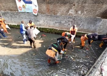 Sebanyak 20 petugas gabungan UPK Badan Air Dinas Lingkungan Hidup dan Satgas Sudin Sumber Daya Air (SDA) Jakarta Selatan, membersihkan...
