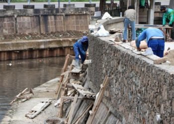 Peninggian tanggul Kali Ciliwung di sepanjang Jalan Kramat IV hingga VI, Kelurahan Kenari, Kecamatan Senen, Jakarta Pusat terus dikebut. "...