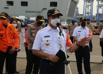 Gubernur DKI Jakarta, Anies Baswedan menjadi pembina upacara dalam Apel Kesiapsiagaan Menghadapi Musim Hujan di lapangan JICT II, Tanjung Priok,...