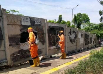 Petugas Penanganan Prasarana dan Sarana Umum (PPSU) Kelurahan Sukabumi Selatan, Kebon Jeruk, Jakarta Barat membersihkan coretan dinding di Jalan Arteri...