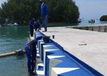 Tanggul penahan gelombang yang membentang sepanjang 400 meter di sisi selatan Kelurahan Pulau Kelapa, Kecamatan Kepulauan Seribu Utara, Kepulauan Seribu...