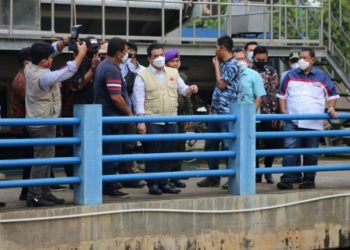 Wakil Gubernur Provinsi DKI Jakarta, Ahmad Riza Patria meninjau kondisi bantaran sungai Kalimalang yang berlokasi di Jalan D.I Panjaitan RT001/06,...