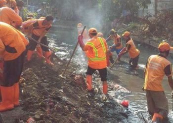 Sekitar 20 personel Petugas Prasarana dan Sarana Umum (PPSU) Kelurahan Kramat Pela, Kebayoran Baru, Jakarta Selatan, membersihkan sampah dan gundukan...