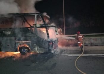 Sebanyak empat mobil pemadam kebakaran dikerahkan untuk mengatasi kebakaran sebuah bus di Jalan Tol Jagorawi, KM 15 Cibubur, Ciracas, Jakarta...