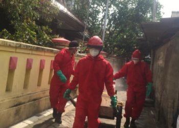 Petugas Sektor 7 Suku Dinas Penanggulangan Kebakaran dan Penyelamatan (Sudin Gulkarmat) Jakarta Utara dan Kepulauan Seribu melakukan penyemprotan disinfektan di...