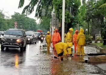 Sebanyak 15 petugas gabungan dari unsur PPSU, Satpol PP, Sudin Perhubungan dan Satgas Bina Marga atasi genangan di Jl Pintu...