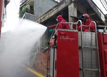 Suku Dinas Penanggulangan Kebakaran dan Penyelamatan (Sudin Gulkarmat) Jakarta Barat melakukan penyemprotan cairan disinfektan di Jl Tawang Mangu I dan...