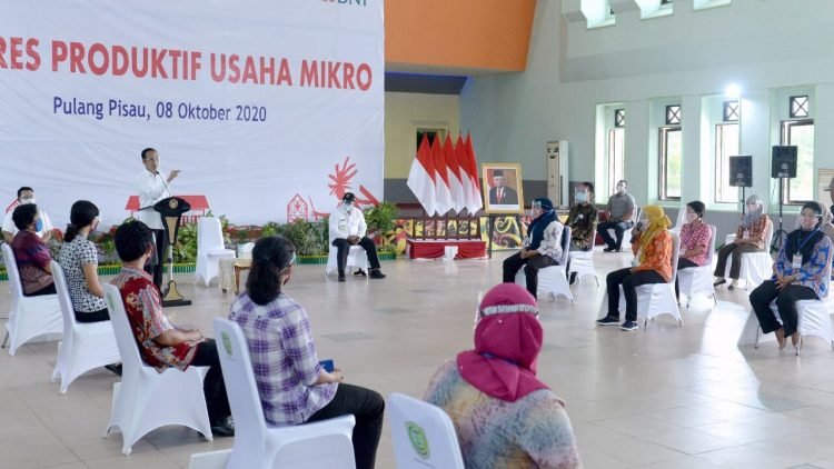 Presiden Joko Widodo menyerahkan Banpres Produktif Usaha Mikro di Provinsi Kalimantan Tengah. Sebanyak 30 pelaku usaha kategori tersebut hadir dalam acara penyerahan yang digelar di Gedung Pertemuan Umum Handep Hapakat, Kabupaten Pulang Pisau, Kalimantan Tengah, pada Kamis, 8 Oktober 2020.