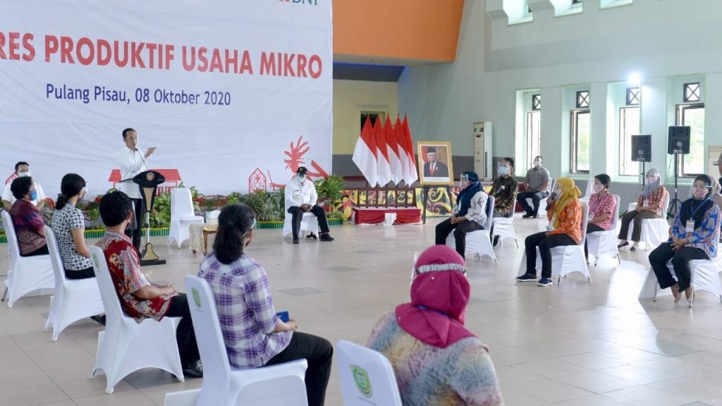 Presiden Joko Widodo menyerahkan Banpres Produktif Usaha Mikro di Provinsi Kalimantan Tengah. Sebanyak 30 pelaku usaha kategori tersebut hadir dalam acara penyerahan yang digelar di Gedung Pertemuan Umum Handep Hapakat, Kabupaten Pulang Pisau, Kalimantan Tengah, pada Kamis, 8 Oktober 2020.