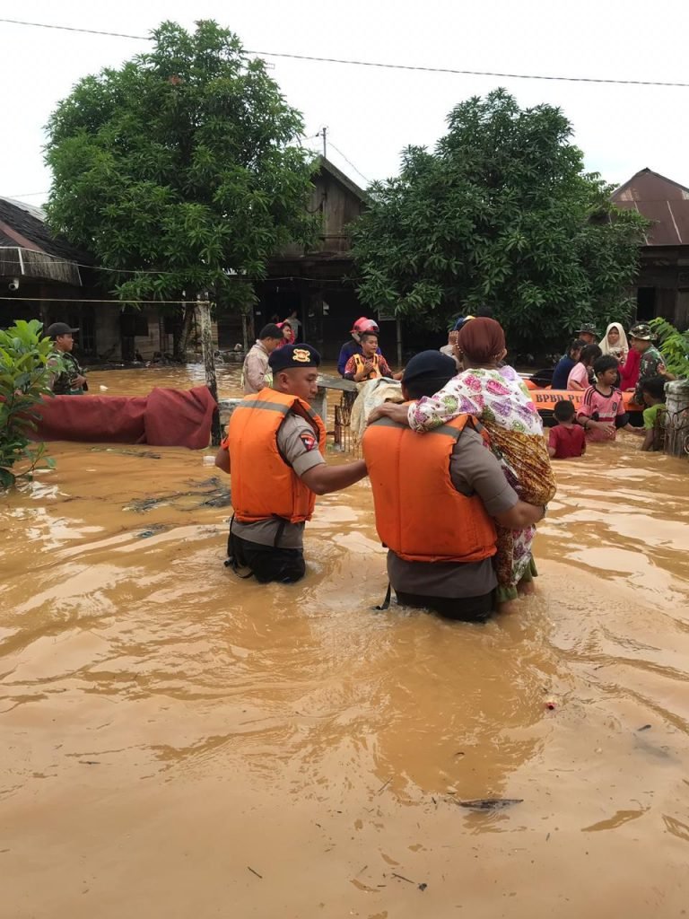 Menghadapi fenomena bencana alam yang terjadi disejumlah wilayah di Indonesia, tanpa terkecuali di Provinsi Kalimantan Selatan (Kalsel), anggota personil Satuan Brigade Mobil (Satbrimob) Polda Kalsel turun membantu mengevakuasi warga yang terdampak banjir di Desa Basung Kecamatan Cempaka Kota Banjarbaru, Minggu (5/1/2020).