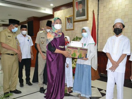 Badan Amil Zakat Nasional (BAZNAS) Badan Amil Zakat Infak Shodaqoh (BAZIS) Jakarta Selatan dan CSR Susu Tujuh Kurma, Rabu (28/4), memberikan santunan pada 50 anak yatim di Ruang Pola Kantor Wali Kota.