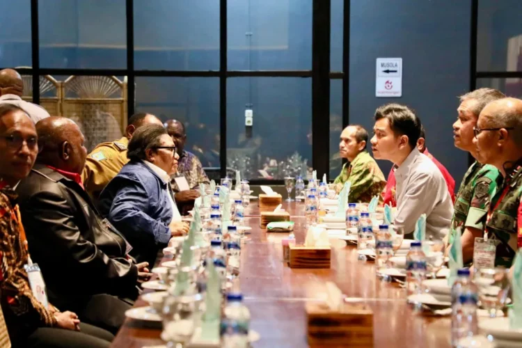 Usai bermain sepak bola bersama anak-anak Sekolah Sepak Bola (SSB) di Stadion Lapangan Pendidikan Itlayikinia, Wakil Presiden (Wapres) Gibran Rakabuming bersilaturahmi dengan jajaran Forum Koordinasi Pimpinan Daerah (Forkopimda) Kabupaten Jayawijaya, para tokoh agama, tokoh adat, dan tokoh masyarakat di Rumah Makan Blambangan, Wamena, Kabupaten Jaya Wijaya, Papua Pegunungan, Selasa (13/01/2025). Pertemuan ini berlangsung penuh kekeluargaan