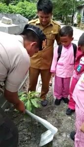 Humas.polri.go.id – Polres Kobar – Pemandangan berbeda terlihat dalam aksi tanam pohon yang dilakukan oleh personel bhabinkamtibmas Polsek Kumai jajaran Polres Kobar, Polda Kalteng Aipda Sulaiman pagi tadi, Senin (6/1/2020) di halaman sekolah taman kanak – kanak (TK) B An – Nur, Desa Batu Belaman, Kobar, Kalteng.