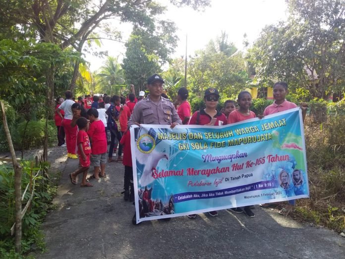 Mimika – Dalam rangka memperingati HUT Pekabaran Injil yang ke-165 di Tanah Papua, Personil Bhabinkamtibmas Kelurahan Wania bersama Jemaat melaksanakan kegiatan jalan sehat bertempat di Gereja GKI Solafide Mapurujaya, Minggu (02/02/2020)