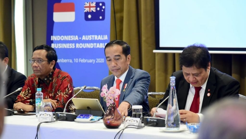 Presiden Joko Widodo menghadiri Indonesia-Australia Business Roundtable yang digelar di Canberra Room, Hotel Hyatt, Canberra, Australia, pada Senin, 10 Februari 2020. Presiden salah satunya menyampaikan soal komitmen pemerintahannya untuk menjadikan Indonesia sebagai negara ramah investasi.