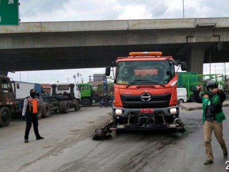 Selama proses pembersihan, Suku Dinas Perhubungan Jakarta Utara mengerahkan petugas untuk mengatur lalu lintas.