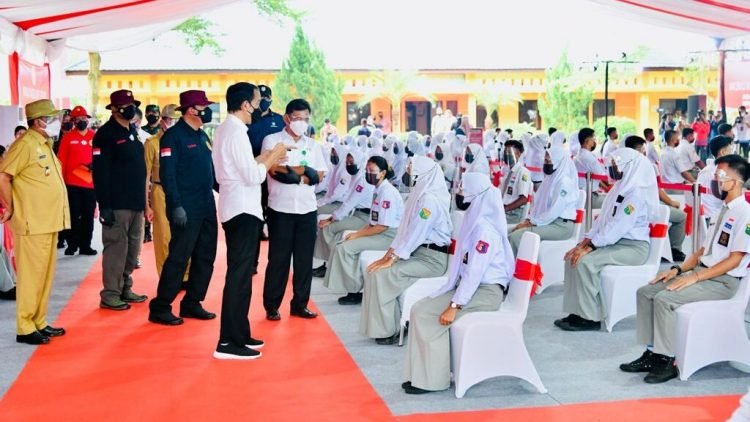 Presiden Joko Widodo meninjau kegiatan vaksinasi bagi pelajar yang digelar di SMKN 1 Beringin, Kabupaten Deli Serdang, pada Kamis, 16 September 2021. Selain peninjauan, Presiden juga berkesempatan untuk berdialog bersama para pelajar melalui konferensi video di enam kabupaten/kota lain yang secara bersamaan melakukan kegiatan vaksinasi.