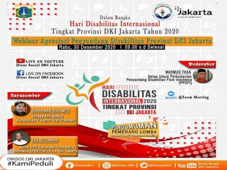 Dinas Sosial DKI Jakarta menggelar webinar Apresiasi Penyandang Disabilitas Provinsi DKI Jakarta. Webinar ini diselenggarakan secara virtual untuk mencegah terjadinya kerumunan selama pandemi Covid-19.