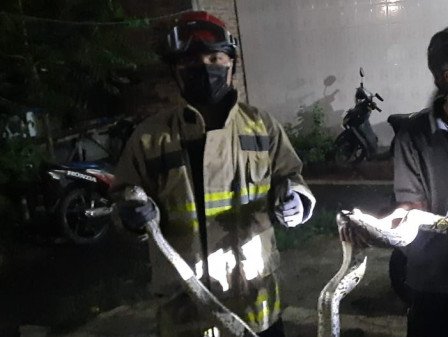 Petugas Sudin Penanggulangan Kebakaran dan Penyelamatan (Gulkarmat) Jakarta Timur mengevakuasi dua ekor ular sanca di lokasi berbeda, Rabu (5/5) malam.
