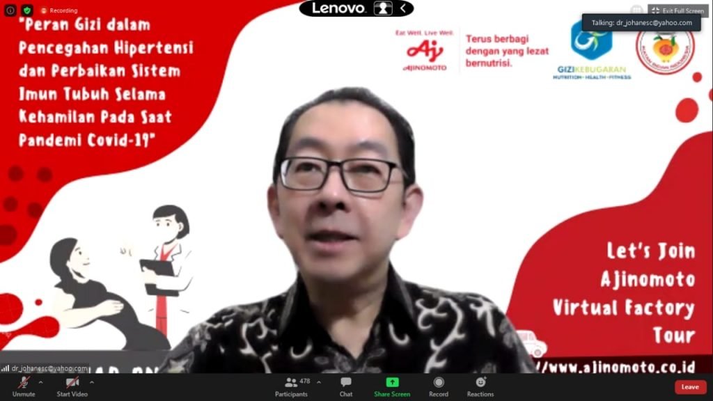 PT Ajinomoto Indonesia bersama Gizi Kebugaran Indonesia menggelar program webinar bertajuk “Peran Gizi Sebagai Langkah Pengendalian Hipertensi dan Menjaga Sistem Imun dalam Kehamilan”. Program edukasi gizi tersebut dihadirkan sebagai upaya Ajinomoto dalam mendukung ibu agar tetap sehat dengan menyebarluaskan fakta informatif tentang bumbu umami dan manfaat klinis Monosodium Glutamat (MSG) di tengah pandemi Covid-19.
