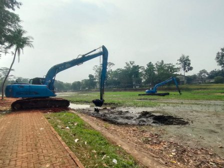 Suku Dinas Sumber Daya Air Jakarta Timur, mengerahkan enam alat berat untuk pengerjaan pengerukan Waduk Mabes TNI di Cilangkap.