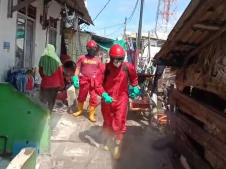 Petugas Sektor 7 Suku Dinas Penanggulangan Kebakaran dan Penyelamatan (Sudin Gulkarmat) Jakarta Utara dan Kepulauan Seribu melakukan disinfeksi fasilitas umum dan lingkungan permukiman warga di RT 04/01, Kelurahan Pulau Panggang, Kecamatan Kepulauan Seribu Utara.