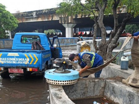 Personel Satuan Pelaksana Sumber Daya Air (Satpel SDA) Kecamatan Pademangan berhasil mengatasi genangan di Jl Lodan Raya dan Jl RE Martadinata di pinggir Kali Ancol.