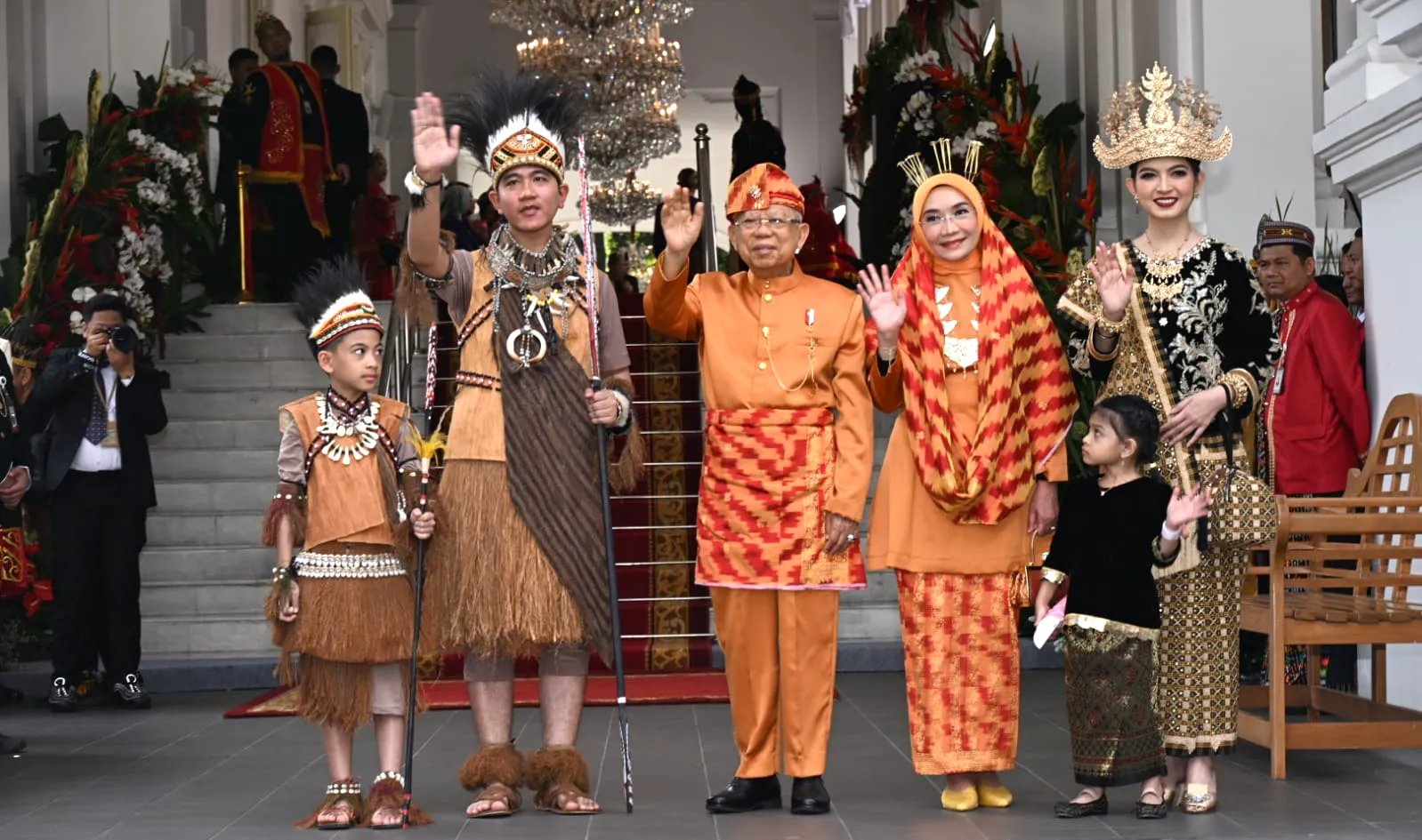 Pada acara ini, Wapres dan Ibu Wury tiba di Istana Merdeka sekitar pukul 09.35 Keduanya tampak serasi mengenakan busana adat Pontianak, Kalimantan Barat dari Suku Melayu Sambas. Wapres menggunakan setelan Teluk Belanga warna kuning emas, dipadu kain sarung corak insang dengan warna senada di pinggang dan memakai penutup kepala yang biasa disebut Tanjak. Sementara itu, Ibu Hj. Wury Ma’ruf Amin juga tampak anggun mengenakan baju kurung polos bernuansa kuning emas dipadu dengan selendang senada yang juga bercorak insang.