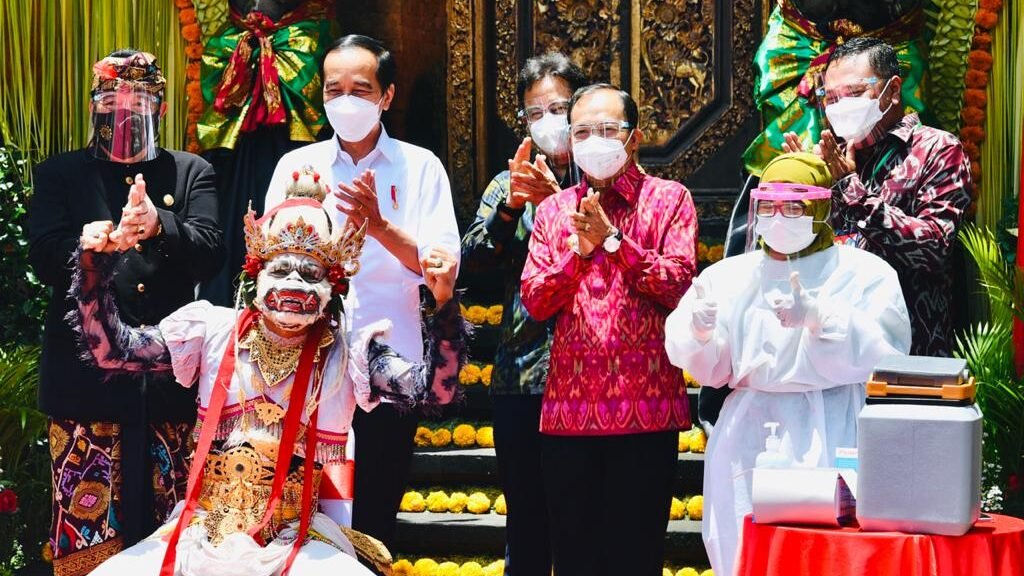 Vaksinasi Covid-19 secara massal yang digelar di Puri Saren Agung, Kecamatan Ubud, Kabupaten Gianyar, pada Selasa, 16 Maret 2021, diberikan kepada kurang lebih 680 orang secara bertahap dengan tetap menerapkan protokol kesehatan secara ketat.