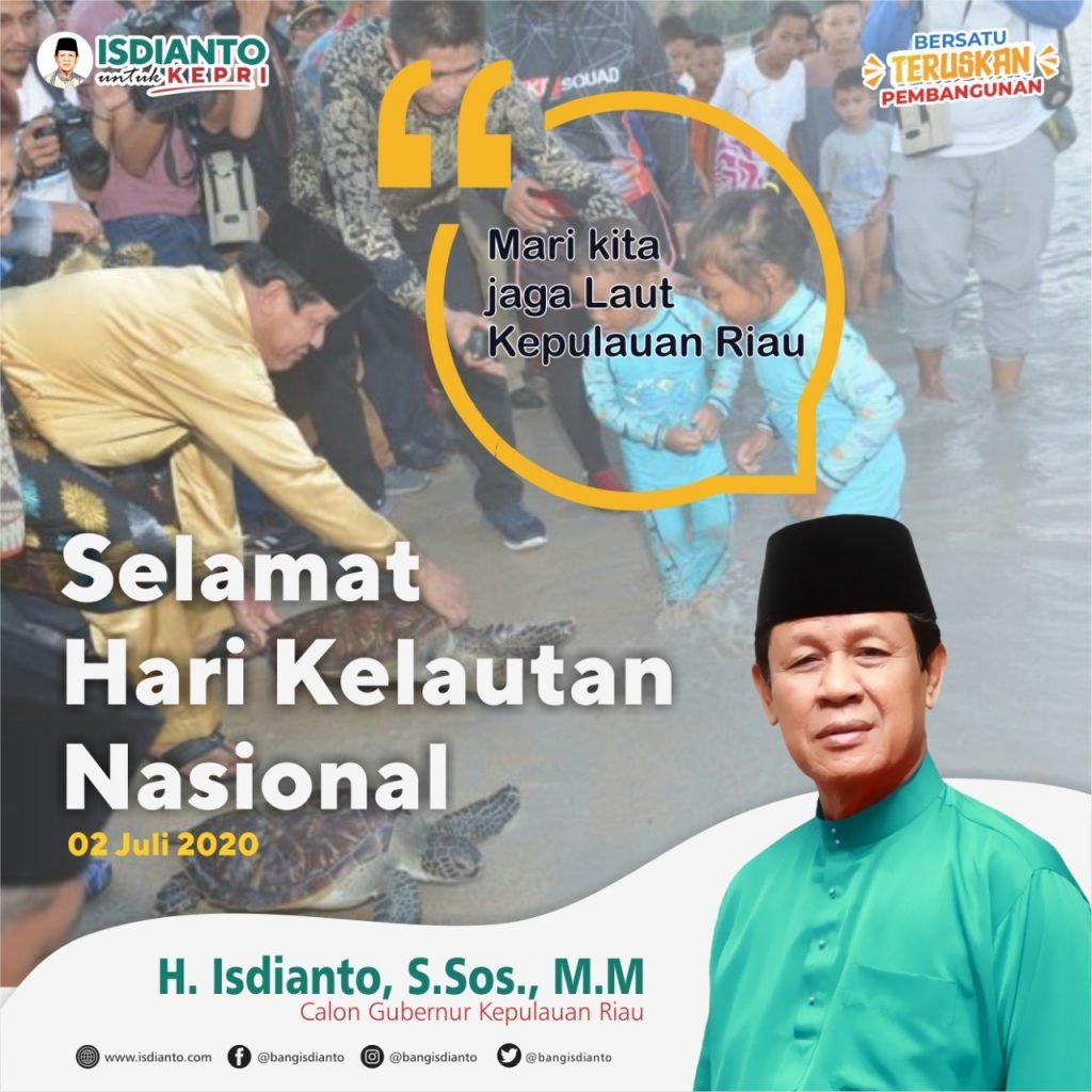 “Selamat memperingati Hari Kelautan Nasional tahun 2020. Kita berharap dengan peringatan ini dapat melahirkan kesadaran bersama serta komitmen yang nyata dan kuat tentang pentingnya menjaga laut sehingga masyarakat bisa merasakan manfaat dan dapat meningkatkan kesejahteraan masyarakat,” kata Isdianto usai mendampingi Menteri Koordinator Maritim dan Investasi, Luhut Binsar Panjaitan di Bandara Hang Nadim Batam.