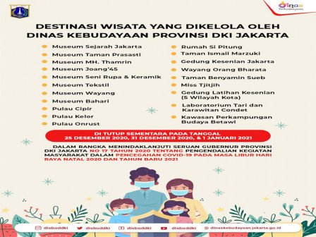 Dinas Kebudayaan (Disbud) DKI Jakarta menutup puluhan destinasi wisata pada libur Natal 2020 hingga Tahun Baru 2021. Ini sebagai cara untuk mencegah penularan Covid-19.