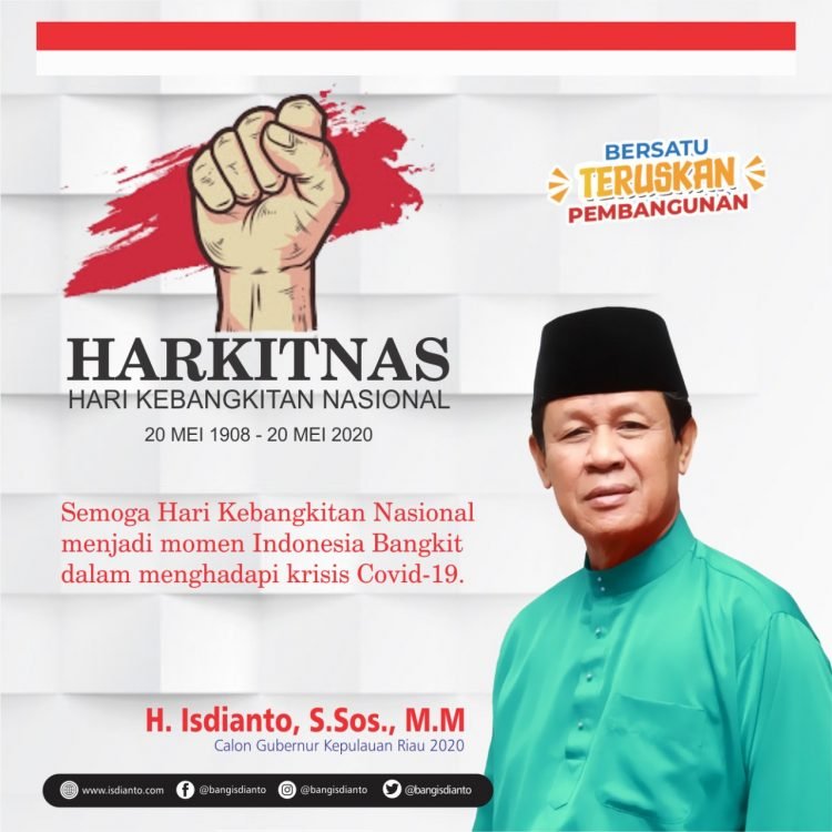 Plt. Gubernur Kepulauan Riau (Kepri) Isdianto, menyampaikan selamat Hari Kebangkitan Nasional (Harkitnas) yang setiap tahunnya diperingati masyarakat Indonesia pada tanggal 20 Mei. Secara historis, tanggal tersebut merupakan tanggal lahirnya salah satu organisasi pertama yang menyuarakan nasionalisme yaitu organisasi pemuda Budi Utomo (Boedi Oetomo).