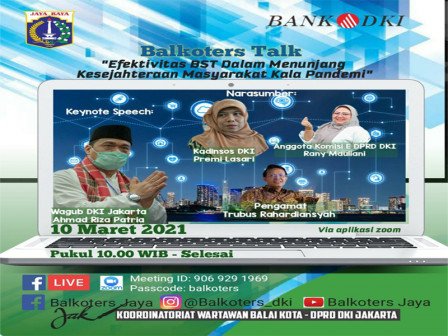 Wakil Gubernur Provinsi DKI Jakarta Ahmad Riza Patria menjadi salah satu pembicara dalam Balkoters Talk dengan tema Efektivitas Bantuan Sosial Tunai (BST) Dalam Menunjang Kesejahteraan Masyarakat Kala Pandemi, Rabu (10/3).