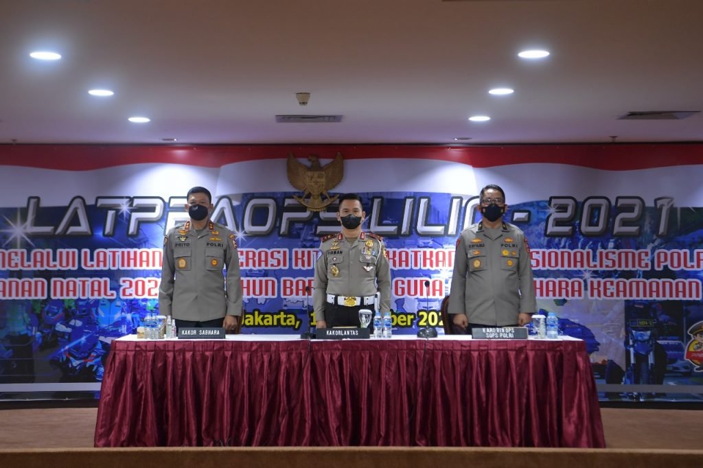Jakarta – Korps Lalu Lintas (Korlantas) Polri menggelar Latihan Pra Operasi dan Bimbingan Teknis (Latpraops Bimtek) bagi para personel dalam rangka Operasi Lilin untuk pengamanan Natal 2021 dan Tahun Baru 2022.