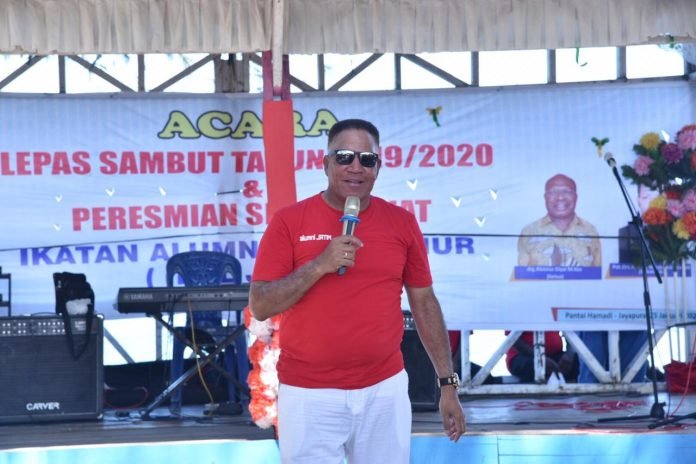 Kemudian dilanjutnya dengan sambutan Ketua Ikatan Alumni Jawa Timur (Ikal Jatim) di Tanah Papua drg. Alosyus Giay, M.Kes menyampaikan bahwa seperti yang ditanamkan pejuang dari kota Pahlawan di Surabaya.