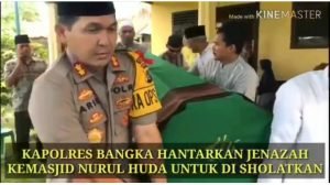 Kapolres Bangka mengantarkan jenazah menuju Masjid Nurul Huda untuk menyolatkan jenazah sampai dengan memakamkan jenazah di TPU Parit Padang Sungailiat.